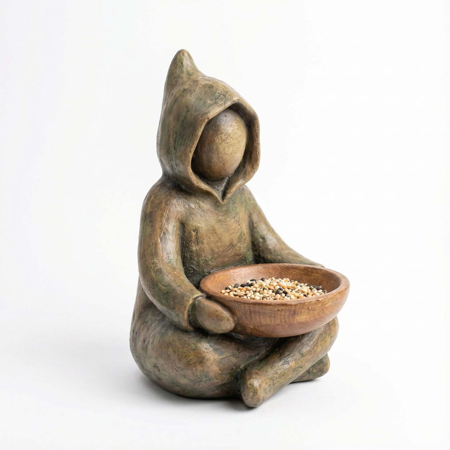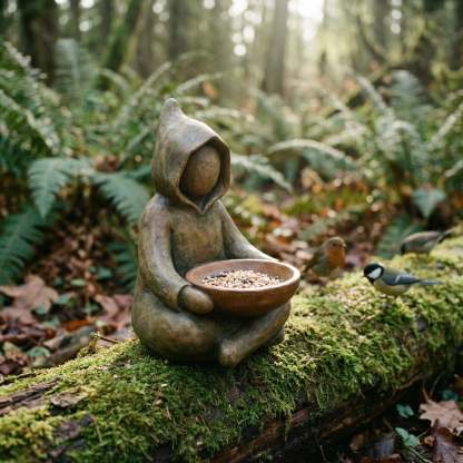 A small, abstract figure sits quietly in your garden,