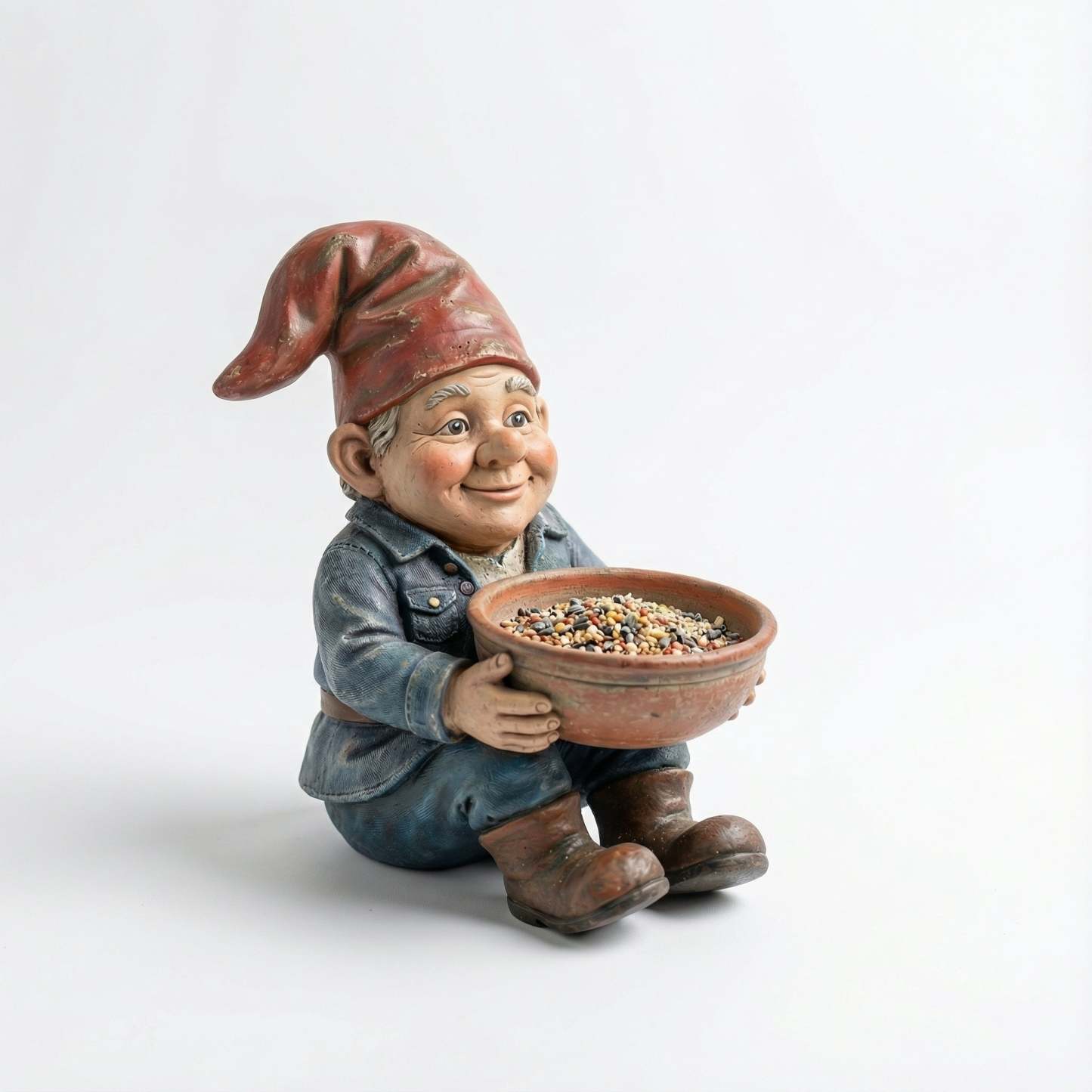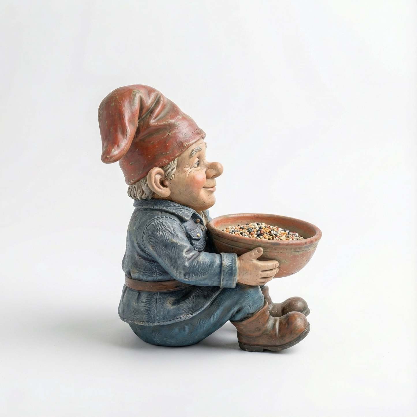 This gnome is: A quiet neighbor、A friend of the wild、A gentle presence in the garden、He doesn’t command the birds. He simply leaves food behind.